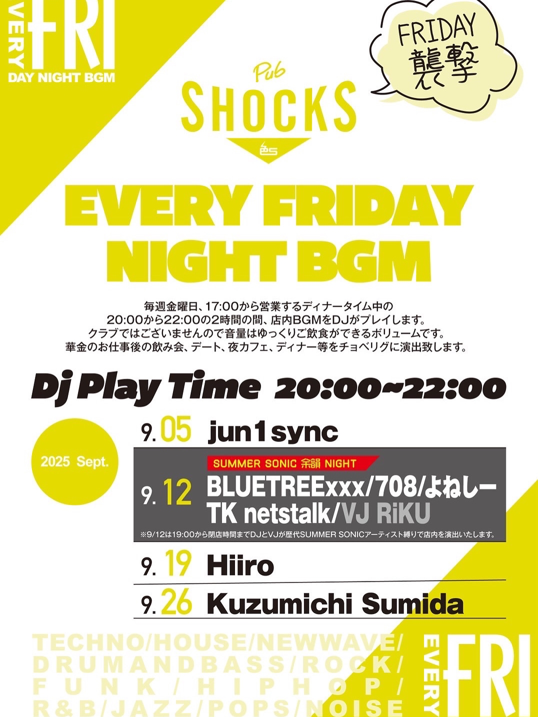 今後のDJ予定ですが、9/26に大阪・福島区にあるPUB SHOCKSさんにて2時間セレクターやります。